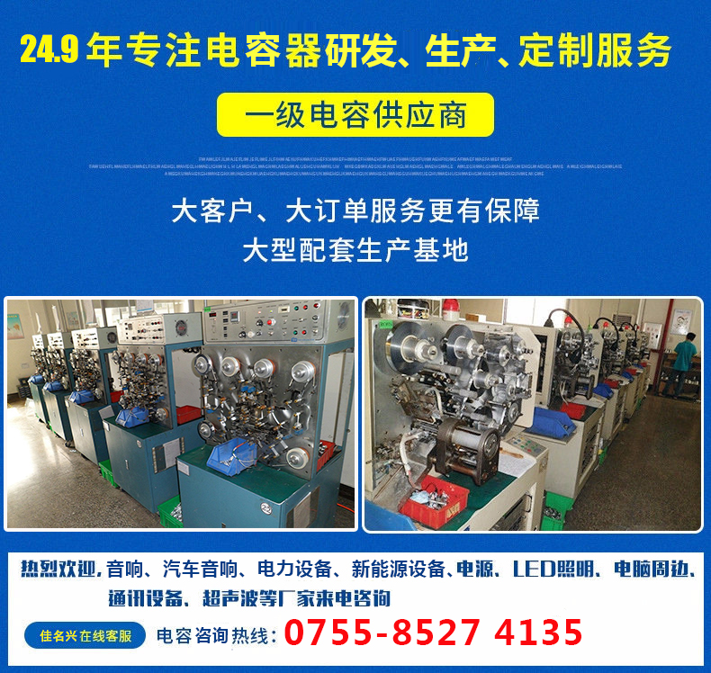 2017年12月28日正式更名為深圳佳名興電容有限公司 佳名興JMX廣東省惠州市電容器工廠占地面積13149平米,廠房面積8227平方米,每年生產(chǎn)的超級電容(單體、模組、方案定制)薄膜類電容(包括:金屬化薄膜電容、軸向薄膜電容,工業(yè)級電源用薄膜電容、長壽命薄膜電容、等)軸向鋁電解電容、電力電容器、雙面金屬化薄膜電容等被動元器件達8-13億只 佳名興JMX電容器60%-70%以上產(chǎn)品出口歐美,印度,東南亞等世界各地,30%-40%銷往中國大陸,產(chǎn)品規(guī)格齊全,體積小,可靠性優(yōu)良,穩(wěn)定性好,價格合理 佳名興JMX電容器被廣泛用于:汽車音響,車載分音器,音響分頻器,專業(yè)音響功放,衛(wèi)星通訊設(shè)備,LED驅(qū)動電源,LED節(jié)能燈,開關(guān)電源及電腦周邊產(chǎn)品等各個電子行業(yè)