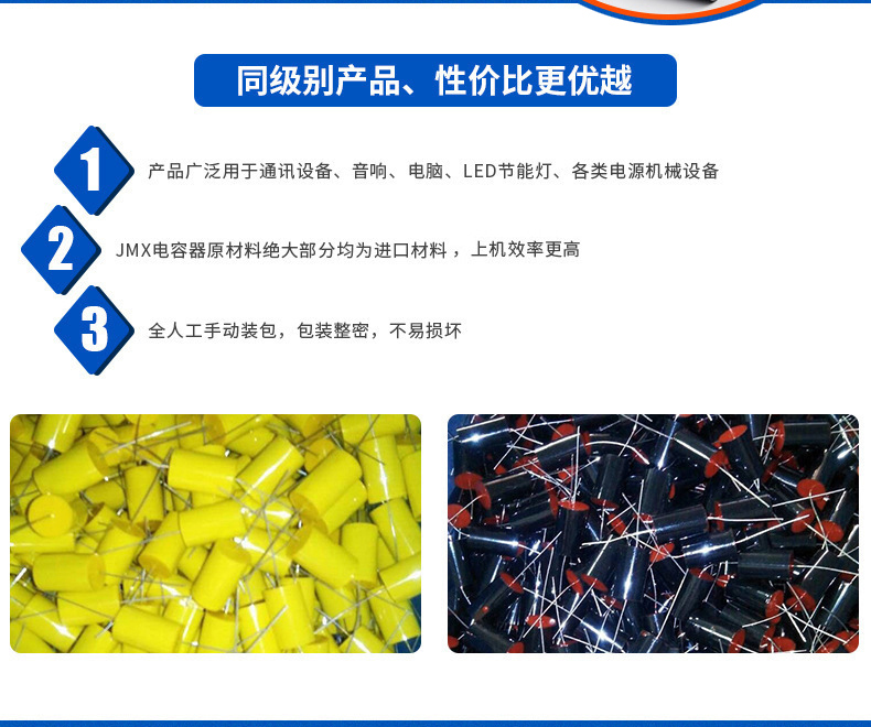 JMX電容為上千家客戶提供電容近20年,JMX電容已成為優(yōu)質(zhì)的電容供應(yīng)商之一,熱誠(chéng)歡迎各界朋友蒞臨佳名興電容器工廠參觀,指導(dǎo)和業(yè)務(wù)洽談。電容器訂購(gòu)熱線:+86 13927412413,了解電容器參數(shù):m.experience-days.net |