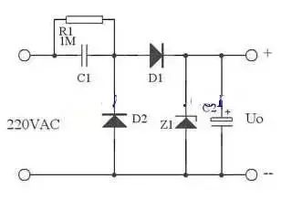 在實(shí)際應(yīng)用中,可以用下圖代替上圖,這里用了Z1正向特性和反向特性,其反向特性(也就是其穩(wěn)壓特性)來穩(wěn)定電壓,其正向特性用來在市電負(fù)半周給C1提供放電回路。