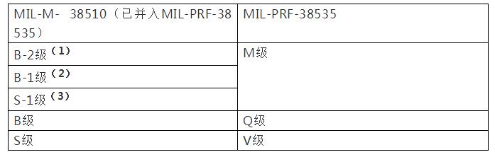 (3)S-1級:完全按照MIL-STD-975(NASA標準的電子電氣和機電源器件目錄)或MIL-STD-1547(航天飛行器和運載火箭用元器件、材料和工藝技術要求)進行采購,并有采購機關的規(guī)范批準。MIL-PRF-38534D混合集成電路規(guī)范(依次低→高等級)