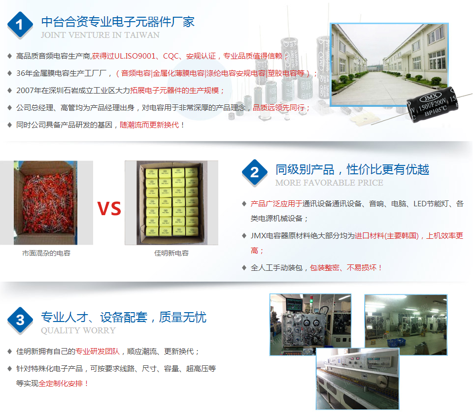 2017年12月28日正式更名為深圳佳名興電容有限公司 佳名興JMX廣東省惠州市電容器工廠占地面積13149平米,廠房面積8227平方米,每年生產(chǎn)的超級(jí)電容(單體、模組、方案定制)薄膜類(lèi)電容(包括:金屬化薄膜電容、軸向薄膜電容,工業(yè)級(jí)電源用薄膜電容、長(zhǎng)壽命薄膜電容、等)軸向鋁電解電容、電力電容器、雙面金屬化薄膜電容等被動(dòng)元器件達(dá)8-13億只 佳名興JMX電容器60%-70%以上產(chǎn)品出口歐美,印度,東南亞等世界各地,30%-40%銷(xiāo)往中國(guó)大陸,產(chǎn)品規(guī)格齊全,體積小,可靠性?xún)?yōu)良,穩(wěn)定性好,價(jià)格合理 佳名興JMX電容器被廣泛用于:汽車(chē)音響,車(chē)載分音器,音響分頻器,專(zhuān)業(yè)音響功放,衛(wèi)星通訊設(shè)備,LED驅(qū)動(dòng)電源,LED節(jié)能燈,開(kāi)關(guān)電源及電腦周邊產(chǎn)品等各個(gè)電子行業(yè)