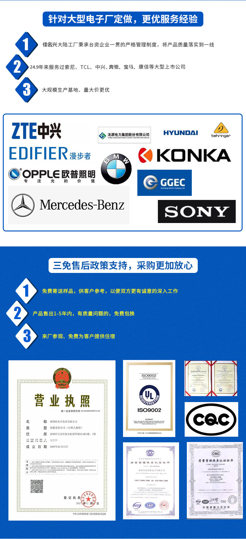 2017年12月28日正式更名為深圳佳名興電容有限公司 佳名興JMX廣東省惠州市電容器工廠占地面積13149平米,廠房面積8227平方米,每年生產(chǎn)的超級電容(單體、模組、方案定制)薄膜類電容(包括:金屬化薄膜電容、軸向薄膜電容,工業(yè)級電源用薄膜電容、長壽命薄膜電容、等)軸向鋁電解電容、電力電容器、雙面金屬化薄膜電容等被動元器件達(dá)8-13億只 佳名興JMX電容器60%-70%以上產(chǎn)品出口歐美,印度,東南亞等世界各地,30%-40%銷往中國大陸,產(chǎn)品規(guī)格齊全,體積小,可靠性優(yōu)良,穩(wěn)定性好,價格合理 佳名興JMX電容器被廣泛用于:汽車音響,車載分音器,音響分頻器,專業(yè)音響功放,衛(wèi)星通訊設(shè)備,LED驅(qū)動電源,LED節(jié)能燈,開關(guān)電源及電腦周邊產(chǎn)品等各個電子行業(yè)